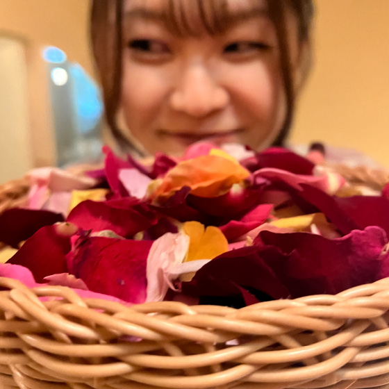 ・1日5組限定 ・定員3名 ・1回40分(清掃時間を挟むため) ・有料:2,200円(税込) ・バラの花びらをカゴに盛ってお渡しします。 ※セットプラン販売中