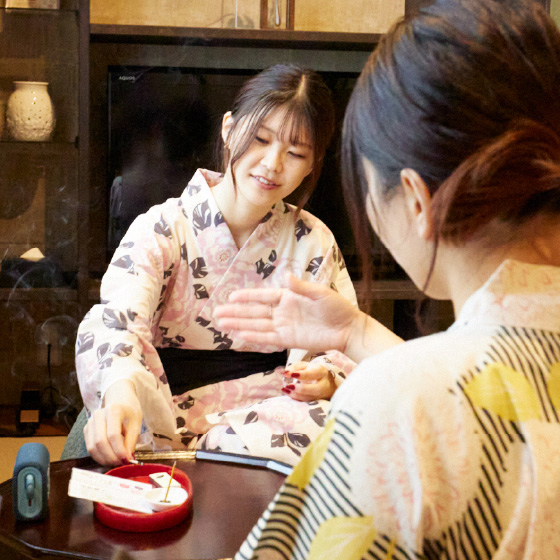 100着以上もある色浴衣。宿泊された女性の方は無料でレンタルいただけます。おしゃれな柄物の浴衣やレトロな浴衣、可愛らしい花柄浴衣など様々な浴衣を揃えております。帯も色の種類が多く、友達と楽しみながらお選びください。お気に入りの一着が見つかるはず。